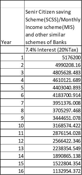 Senior Citizens saving Scheme or SCSS (Max limit Rs 1500000, 7.4% Interest rate as on 2022), post office monthly income scheme or MIS (Max limit Rs 900000, 6.6% interest rate). Banks rates could vary a little but for longer duration FD’s you get better ROI. For ease of calculation and comparison let us assume that all the schemes give a similar interest rate of 7.4%.