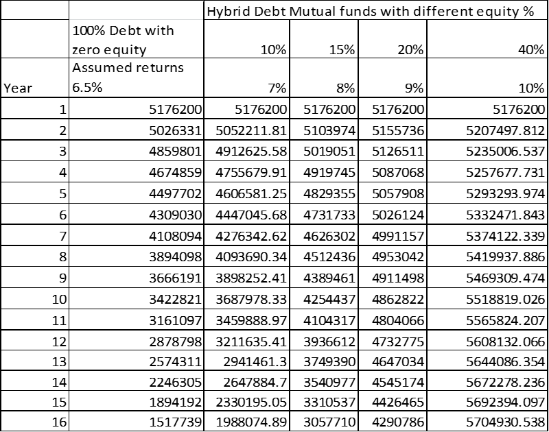 The above table shows the balance amount of commutation of pension of Rs 51,76,200 after with drawl of Rs 40,783 per month (Refer table 1 row h to m. 39,783 to make up short fall in pension due to commutation, 1000 for capital gains tax liability on the amount with drawn). As shown the above table let’s say one invests Rs 5176200 in a debt MF that earns 6.5% returns and one withdraws Rs 40883 per month from the corpus then at the 16th year Rs 1517739 will still be left when the pension gets fully restored. So to say this way you get full pension as if you never commuted and at the end of 15 yrs, you still have about 15 lakhs left. If the amount is better invested in a hybrid MF having 40% equity content and giving 10% returns( which is highly possible with very minimal risk) then one could have about 57 lakhs left at the end of 15th year. The remaining corpus at different equity contents is depicted in row 16. The higher the equity content, the more the returns likely to be and larger the corpus at the end. From the above table at assumed returns of 9% for a hybrid MF with 20 % equity content, the corpus at end would be about 43 lakhs.