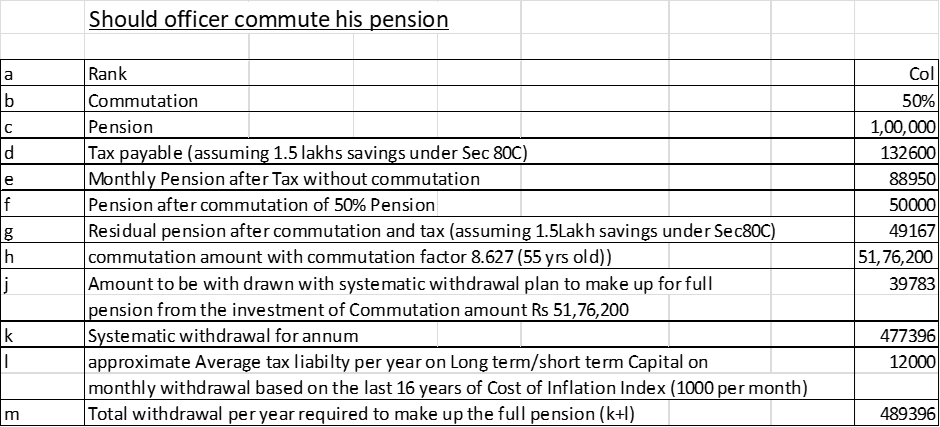 The main reason for people to not commute is reduced monthly takeaway. When commuting one can use systematic withdrawal plan(SWP from debt mutual fund) from commuted corpus to draw a monthly amount which is the difference between uncommuted and commuted pension. This way the monthly take away will be same of non commuted pension. Here I am taking example a Colonel retiring at 55 yrs.