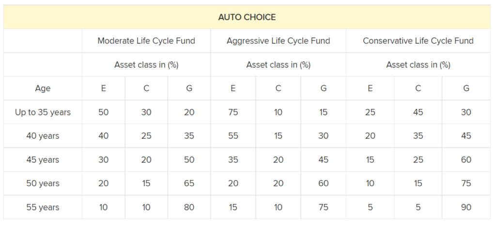 1) Moderate Life Cycle Fund: It is the default option which caps the equity exposure to maximum of 50%.